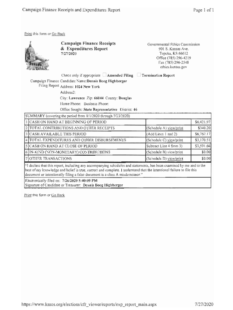 Campaign Finance Receipts and Expenditures Reportage 1 of 1Print this form or Go BackCampaign Finance Receipts