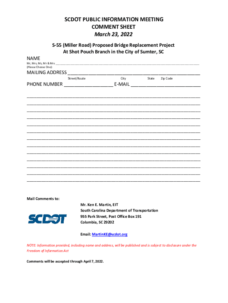 SCOT PUBLIC INFORMATION MEETING COMMENT SHEET March 23, 2022 S55 (Miller Road) Proposed Bridge Replacement Project At Shot Pouch Branch in the City of Sumter, SC NAME Mr, Mrs, Ms, Mr & Mrs ___ (Please