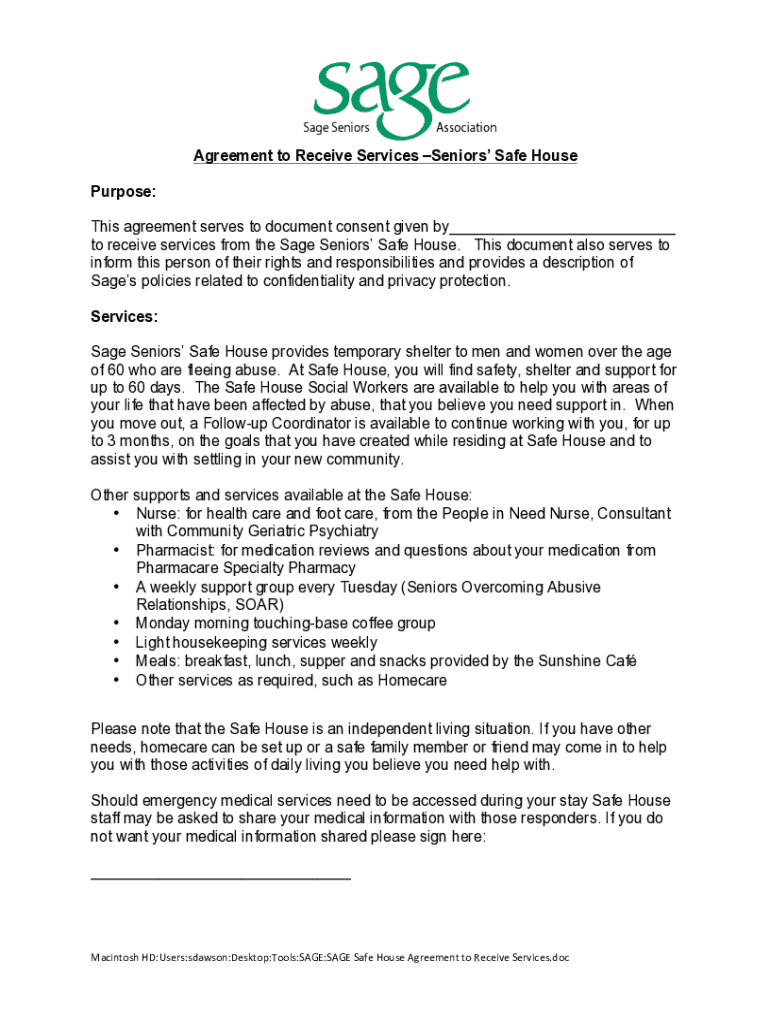 Agreement to Receive Services Seniors Safe House Purpose: This agreement serves to document consent given by___ to receive services from the Sage Seniors Safe House. This document also serves to inform