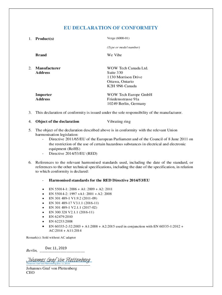 EU DECLARATION OF CONFORMITY 1. Product(s)Verge (600001) (Type or model number)Brandie Vibe2. Manufacturer AddressImporter Address Tech Canada Ltd. Suite 330 1130 Morrison Drive Ottawa, Ontario K2H