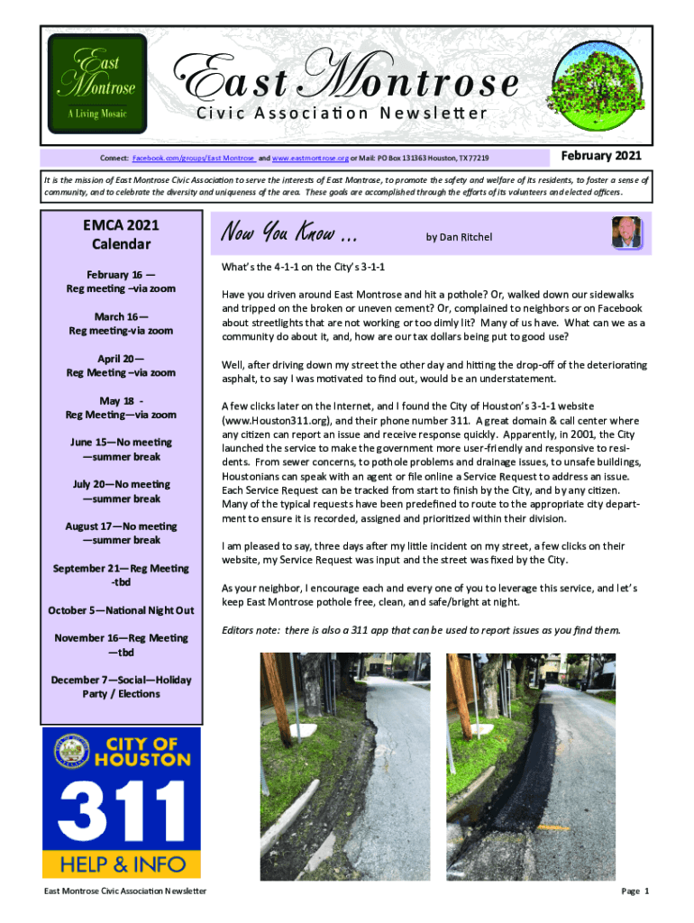East Montrose C i v i c A s s o c i a ti o n N e w s l e TT her Connect: Facebook.com/groups/East Montrose and www.eastmontrose.org or Mail: PO Box 131363 Houston, TX 77219February 2021It is the mission
