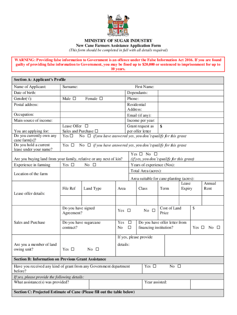 MINISTRY OF SUGAR INDUSTRY New Cane Farmers Assistance Application Form (This form should be completed in full of all details required) WARNING: Providing false information to Government is an offense
