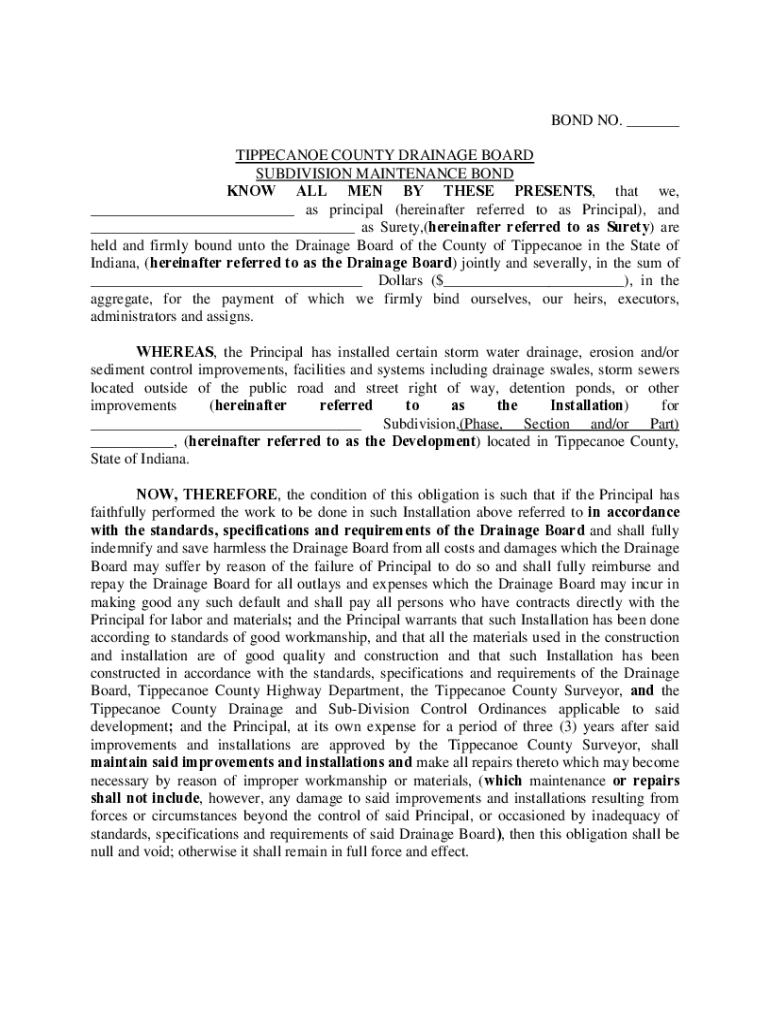BOND NO. ___ TIPPECANOE COUNTY DRAINAGE BOARD SUBDIVISION MAINTENANCE BOND KNOW ALL MEN BY THESE PRESENTS, that we, ___ as principal (hereinafter referred to as Principal), and ___ as Surety, (hereinafter