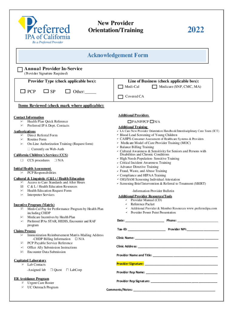 (Provider Signature Required)Provider Type (check applicable box):Line of Business (check applicable box):