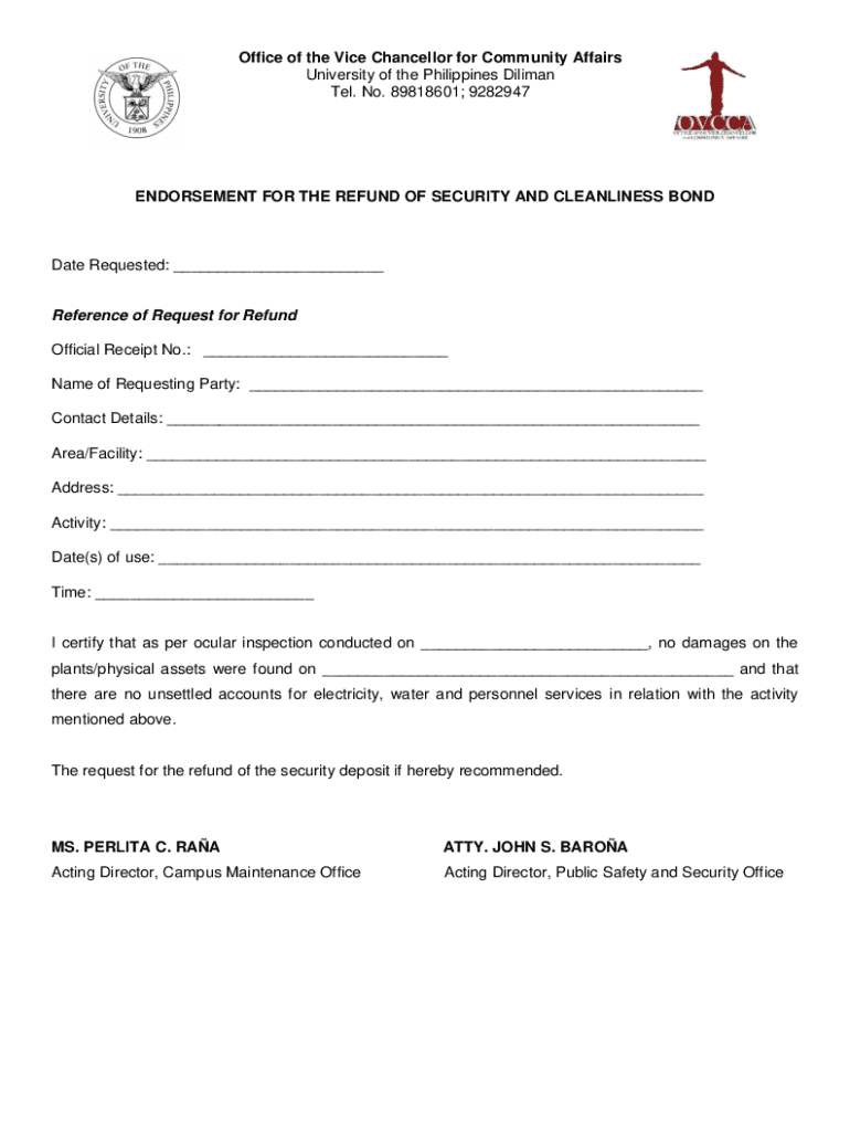 Office of the Vice Chancellor for Community Affairs University of the Philippines Dalian Tel. No. 89818601; 9282947ENDORSEMENT FOR THE REFUND OF SECURITY AND CLEANLINESS Bondage Requested: ___Reference