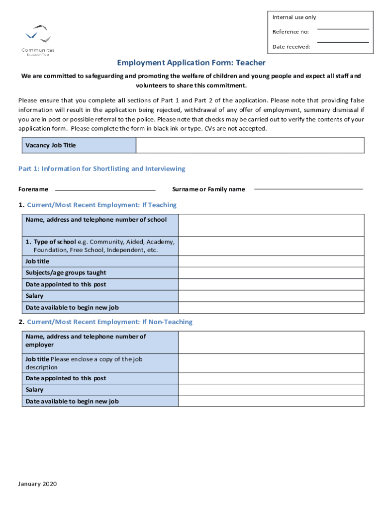 Internal use only Reference no: Date received:Employment Application Form: Teacher We are committed to safeguarding and promoting the welfare of children and young people and expect all staff and
