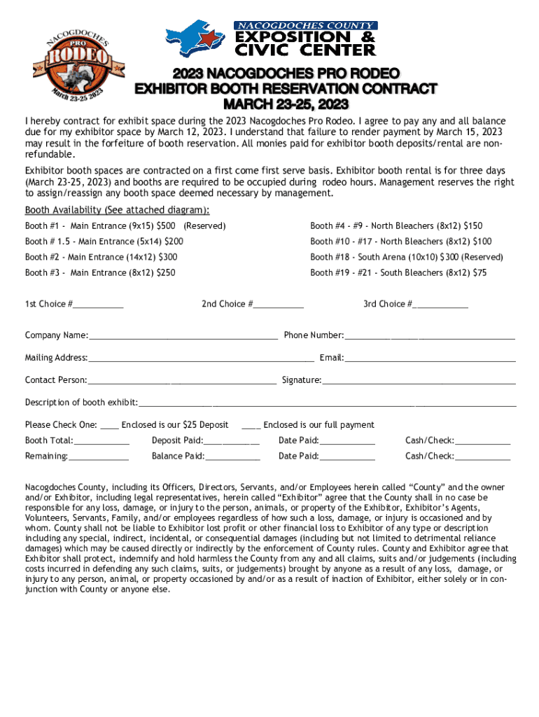 I hereby contract for exhibit space during the 2023 Nacogdoches Pro Rodeo. I agree to pay any and all balance due for my exhibitor space by March 12, 2023. Furthermore, I understand that failure to