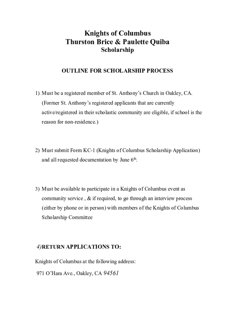 Knights of Columbus Thurston Brice & Paulette Quibi ScholarshipOUTLINE FOR SCHOLARSHIP PROCESS1) Must be a registered member of St. Anthony's Church in Oakley, CA. (Former St. Anthony's registered