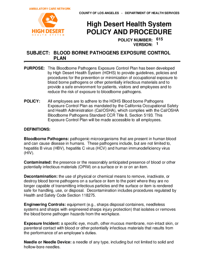 AMBULATORY CARE NETWORKCOUNTY OF LOS ANGELES DEPARTMENT OF HEALTH SERVICESHigh Desert Health System POLICY AND PROCEDURE POLICY NUMBER: 615 VERSION: 1SUBJECT: Blood-borne PATHOGENS EXPOSURE CONTROL