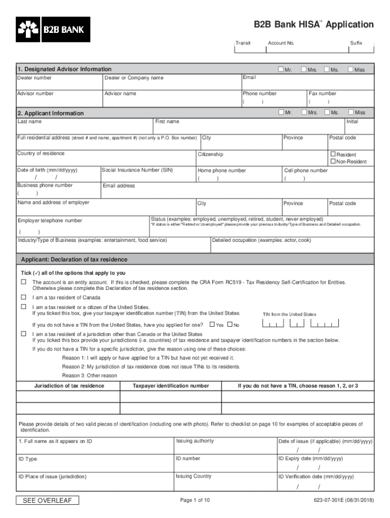 B2B Bank High Interest Savings Account (HIS)ApplicationPlease include:An initial deposit made by personal check for a minimum amount of $1.00 for the InterInstitutionFunds Transfer (GIFT) Program