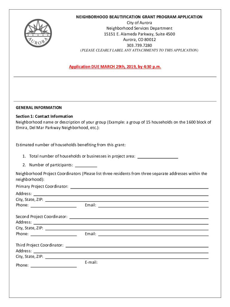 NEIGHBORHOOD BEAUTIFICATION GRANT PROGRAM APPLICATION City of Aurora Neighborhood Services Department 15151 E. Alameda Parkway, Suite 4500 Aurora, CO 80012 303.739.7280 (PLEASE CLEARLY LABEL ANY ATTACHMENTS