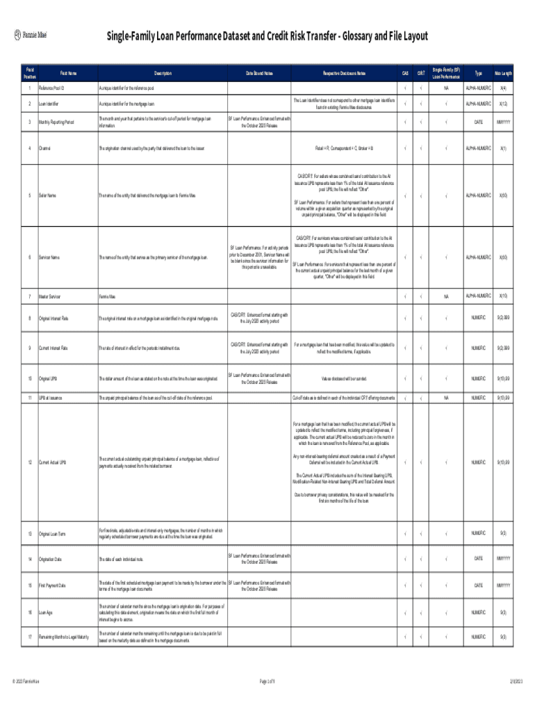 SingleFamily Loan Performance Dataset and Credit Risk Transfer Glossary and File Layout Field Positioned NameDescription1Reference Pool IDA unique identifier for the reference pool.2Loan Identifier