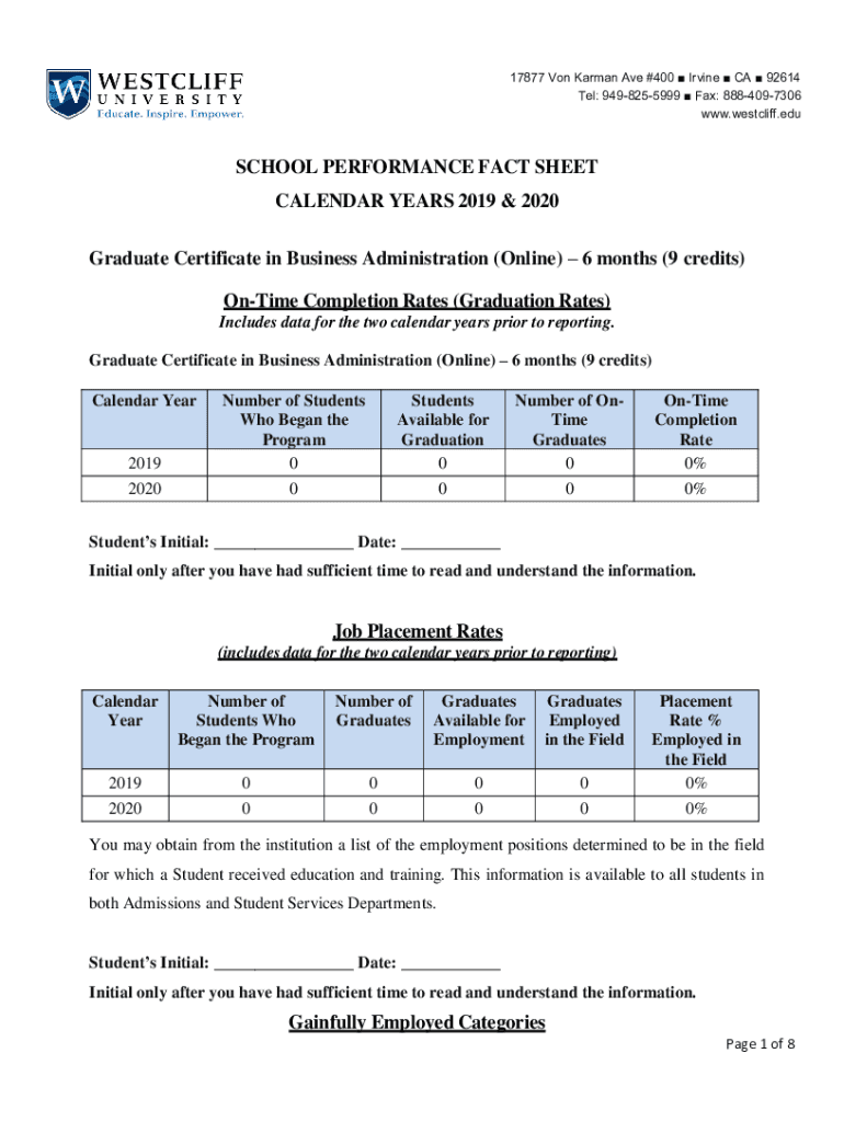 17877 On Kármán Ave #400 Irvine CA 92614 Tel: 9498255999 Fax: 8884097306 www.westcliff.eduSCHOOL PERFORMANCE FACT SHEET CALENDAR YEARS 2019 & 2020 Graduate Certificate in Business Administration