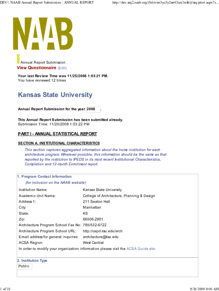 DEV SAAB Annual Report Submission : ANNUAL REPORT1 of 18http://dev.arq2.naab.org/(S(tsvwc3yc5y2arr45iex1wfat))/ARQ/print.aspx?s... Annual Report Submission View Questionnaire (Edit) Your last Re view