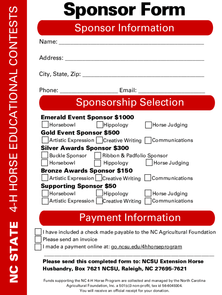 NC STATE 4H HORSE EDUCATIONAL CONTESTSSPONSORSHIPOPPORTUNITIES 2022NC STATE 4H HORSE EDUCATIONAL CONTESTSSponsorship Request Dear Potential Sponsor: Plans are in progress for the 2022 NC State 4H