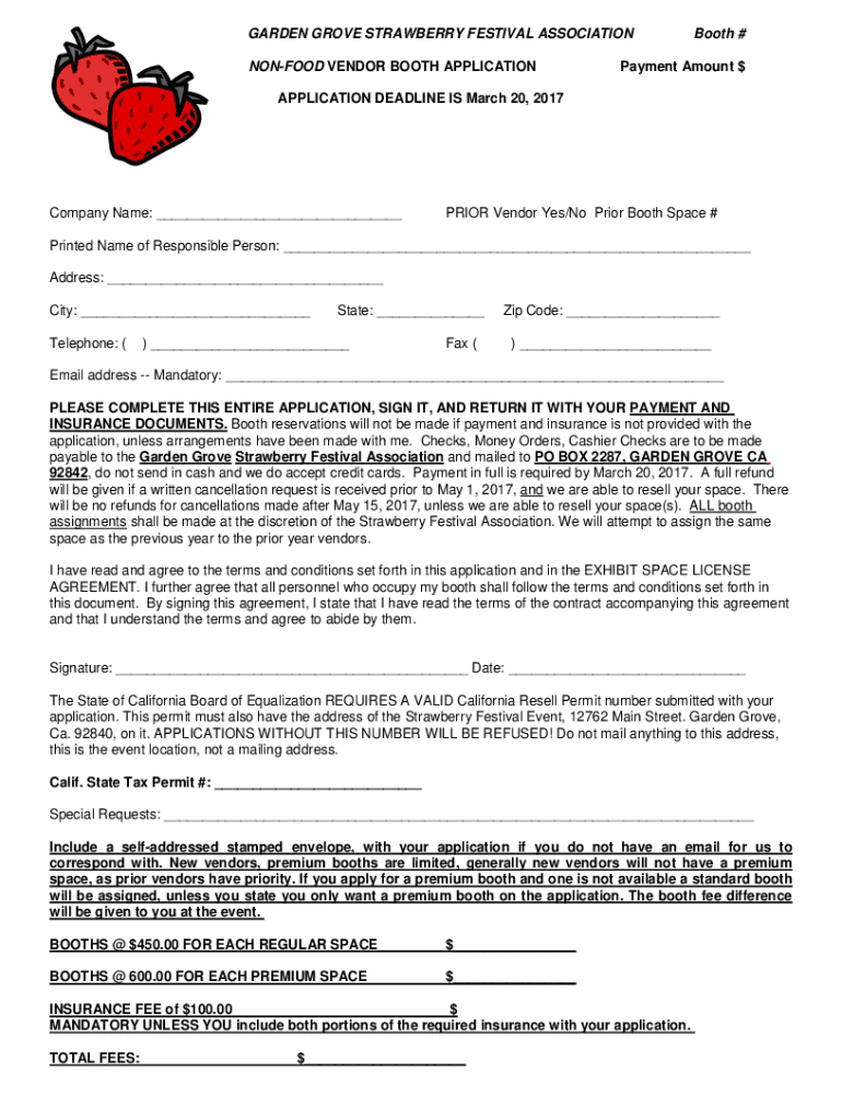 GARDEN GROVE STRAWBERRY FESTIVAL ASSOCIATION NONFOOD VENDOR BOOTH APPLICATION Booth #Payment Amount APPLICATION DEADLINE IS March 20, 2017Company Name: ___PRIOR Vendor Yes/No Prior Booth Space #Printed