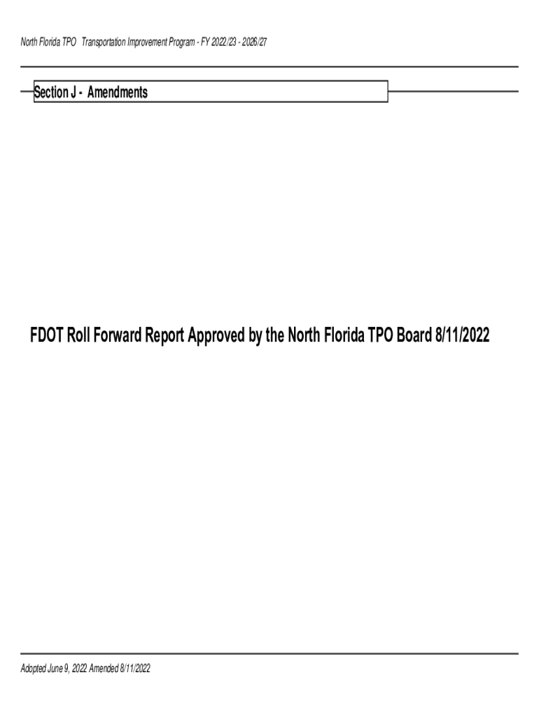 North Florida TPO Transportation Improvement Program FY 2022/23 2026/27Section J AmendmentsFDOT Roll Forward Report Approved by the North Florida TPO Board 8/11/2022. Adopted June 9, 2022, Amended