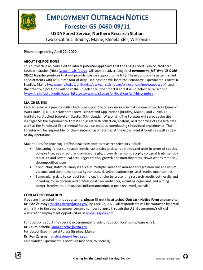 EMPLOYMENT OUTREACH NOTICE Forester GS046009/11 USDA Forest Service, Northern Research Station Two Locations: Bradley, Maine; Rhinelander, Wisconsin Please respond by April 22, 2022, ABOUT THE POSITIONS
