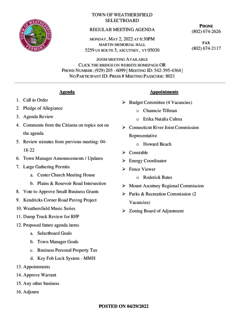 TOWN OF WETHERSFIELD SELECTOR REGULAR MEETING AGENDAPHONE (802) 6742626MONDAY, MAY 2, 2022, AT 6:30PM MARTIN MEMORIAL HALL 5259 US ROUTE 5, ACUTE, VT 05030(802) 6742117FAXZOOM MEETING AVAILABLE CLICK