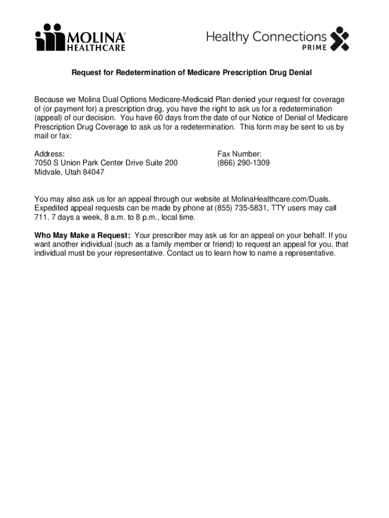 Request for Redetermination of Medicare Prescription Drug DenialBecause we Molina Dual Options Medicare Medicaid Plan denied your request for coverage of (or payment for) a prescription drug, you
