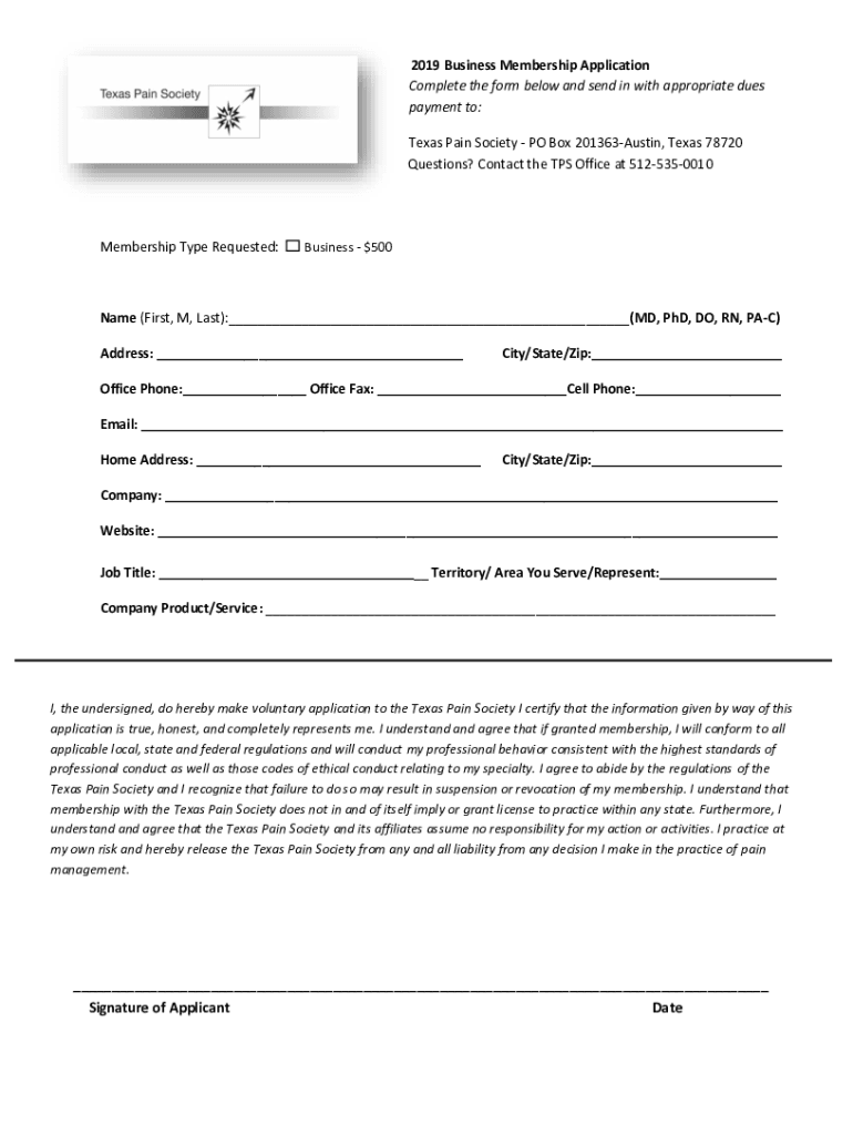 2019 Business Membership Application Complete the form below and send in with appropriate dues' payment to: Texas Pain Society PO Box 201363Austin, Texas 78720 Questions? Contact the TPS Office at
