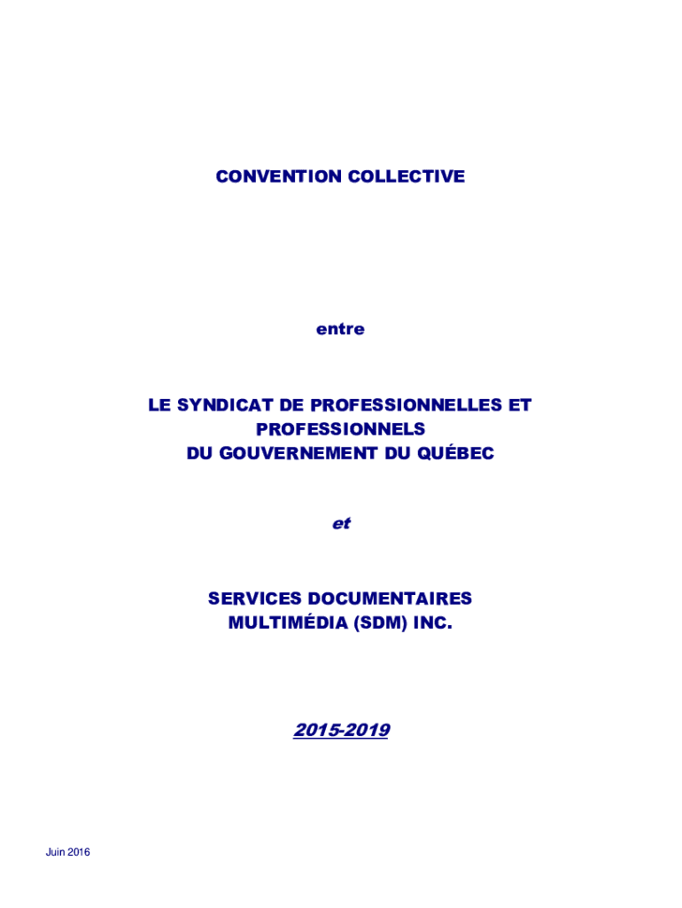 CONVENTION COLLECTIVEentreLE SYNDICATE DE PROFESSIONNELLES ET PROFESSIONALS DU GOVERNMENT DU QUBECetSERVICES DOCUMENTARIES MULTIMEDIA (SDM) INC.20152019Juin 2016TABLE DES MATURES CHARITÉ 10.00 GRANTS