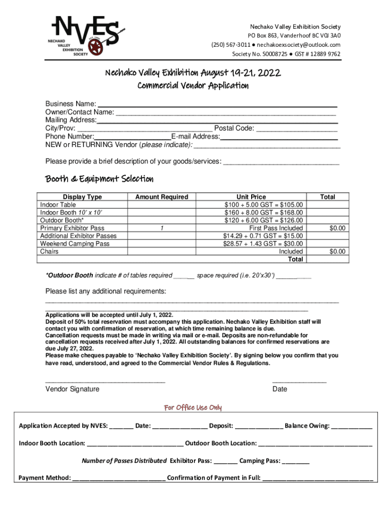 Submit the filled out Nechako Valley Exhibition returns form according to the instructions provided.
