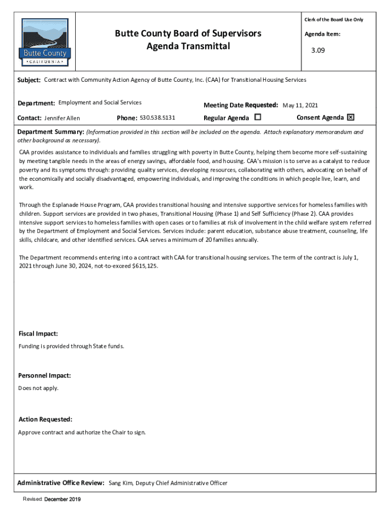 Agenda TransmittalAgenda Item:3.09Subject: Contract with Community Action Agency of Butte County, Inc. (CAA) for Transitional Housing Services