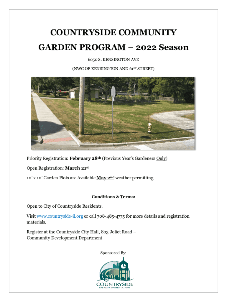 COUNTRYSIDE COMMUNITY GARDEN PROGRAM 2022 Season 6050 S. KENSINGTON AVE (NFC OF KENSINGTON AND 61ST STREET)Priority Registration: February 28th (Previous Years Gardeners Only) Open Registration: March