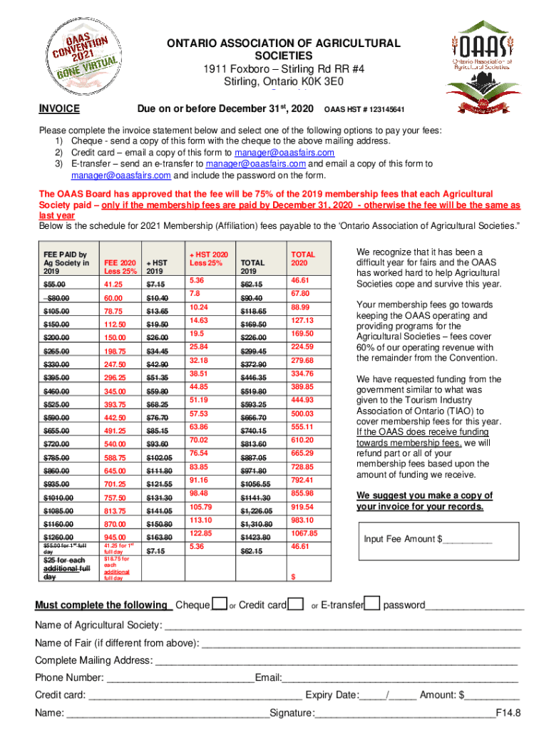 manager@oaasfairs.comDue on or before December 31st, 2020INVOICEOAAS HST # 123145641Please complete