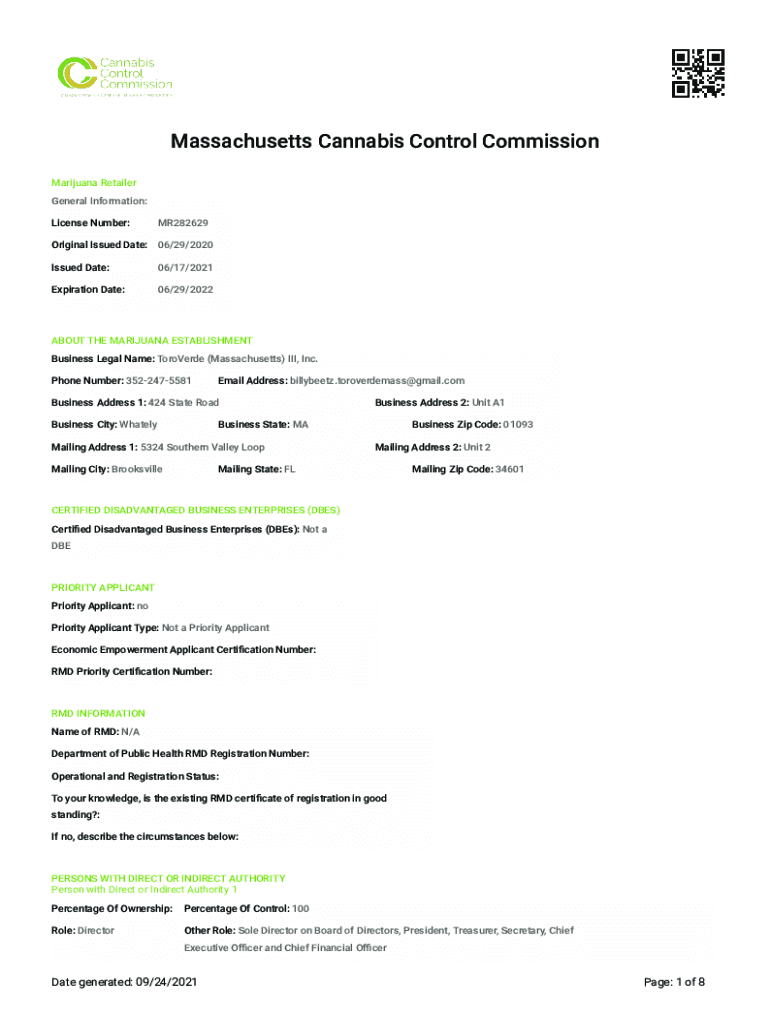 Massachusetts Cannabis Control Commission Marijuana Retailer General Information: License Number:MR282629Original Issued Date: 06/29/2020 Issued Date:06/17/2021Expiration Date:06/29/2022ABOUT THE