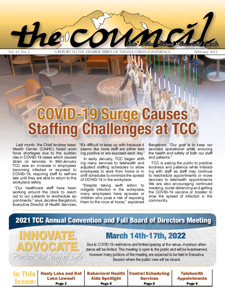 Dena Nina Hen ash Our Land Speaks Vol. 47, No. 2A REPORT TO THE MEMBER TRIBES OF BANANA CHIEFS CONFERENCE February 2022COVID19 Surge Causes Staffing Challenges at TCC Last month, the Chief Andrew