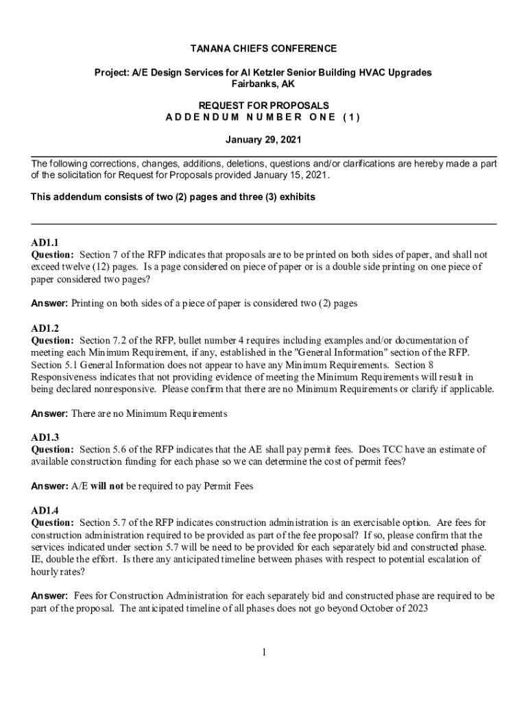 BANANA CHIEFS CONFERENCE Project: A/E Design Services for Al Settler Senior Building HVAC Upgrades Fairbanks, AK REQUEST FOR PROPOSALS ADDENDUM NUMBER ONE (1) January 29, 2021, The following corrections,