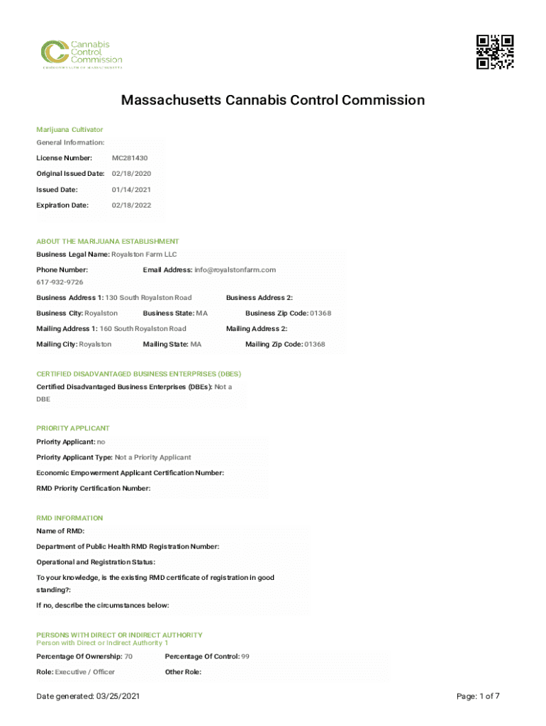 Massachusetts Cannabis Control Commission Marijuana Cultivator General Information: License Number:MC281430Original Issued Date: 02/18/2020 Issued Date:01/14/2021Expiration Date:02/18/2022ABOUT THE