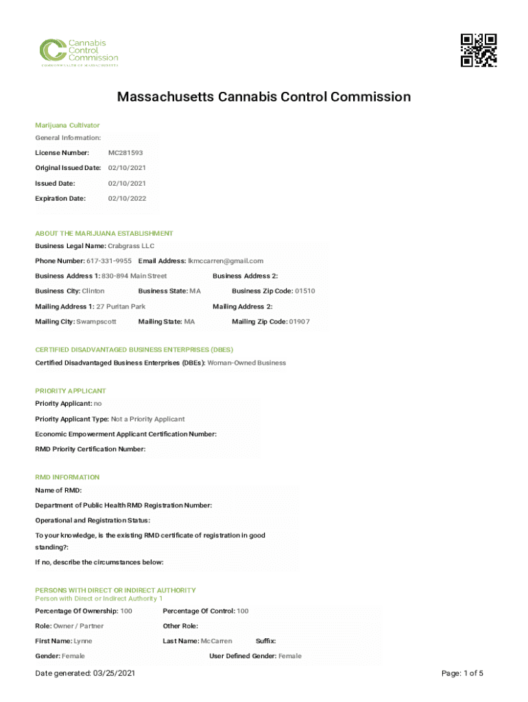 Massachusetts Cannabis Control Commission Marijuana Cultivator General Information: License Number:MC281593Original Issued Date: 02/10/2021 Issued Date:02/10/2021Expiration Date:02/10/2022ABOUT THE