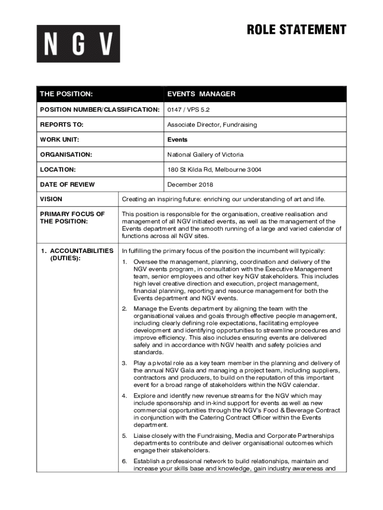 ROLE STATEMENT POSITION:EVENTS MANAGERPOSITION NUMBER/CLASSIFICATION:0147 / VPS 5.2REPORTS TO:Associate Director, FundraisingWORK UNIT:EventsORGANISATION:National Gallery of VictoriaLOCATION:180 St