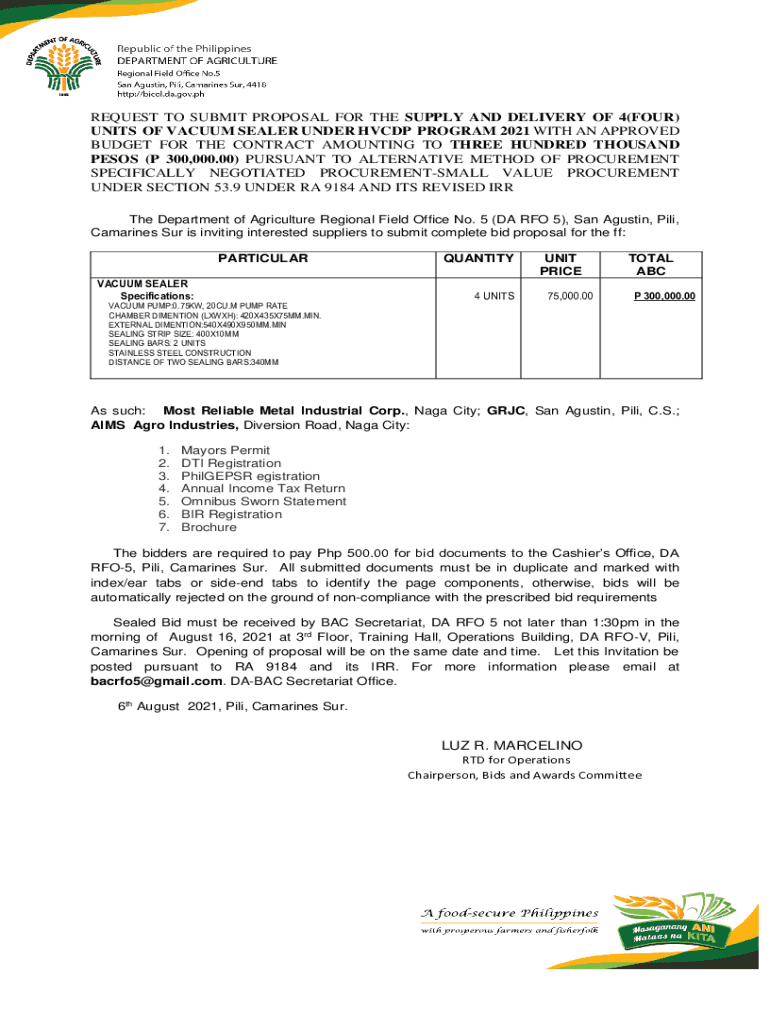 REQUEST TO SUBMIT PROPOSAL FOR THE SUPPLY AND DELIVERY OF 4(FOUR) UNITS OF VACUUM SEALER UNDER HVDC PROGRAM 2021 WITH AN APPROVED BUDGET FOR THE CONTRACT AMOUNTING TO THREE HUNDRED THOUSAND PESOS