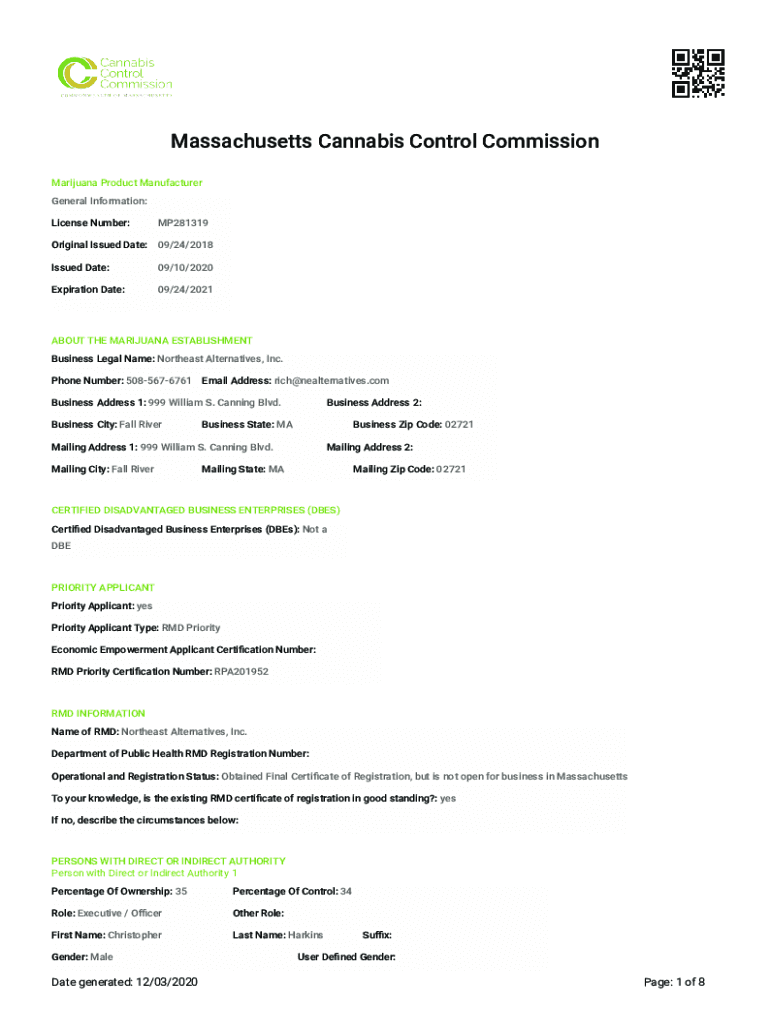 Massachusetts Cannabis Control Commission Marijuana Product Manufacturer General Information: License Number:MP281319Original Issued Date: 09/24/2018 Issued Date:09/10/2020Expiration Date:09/24/2021ABOUT