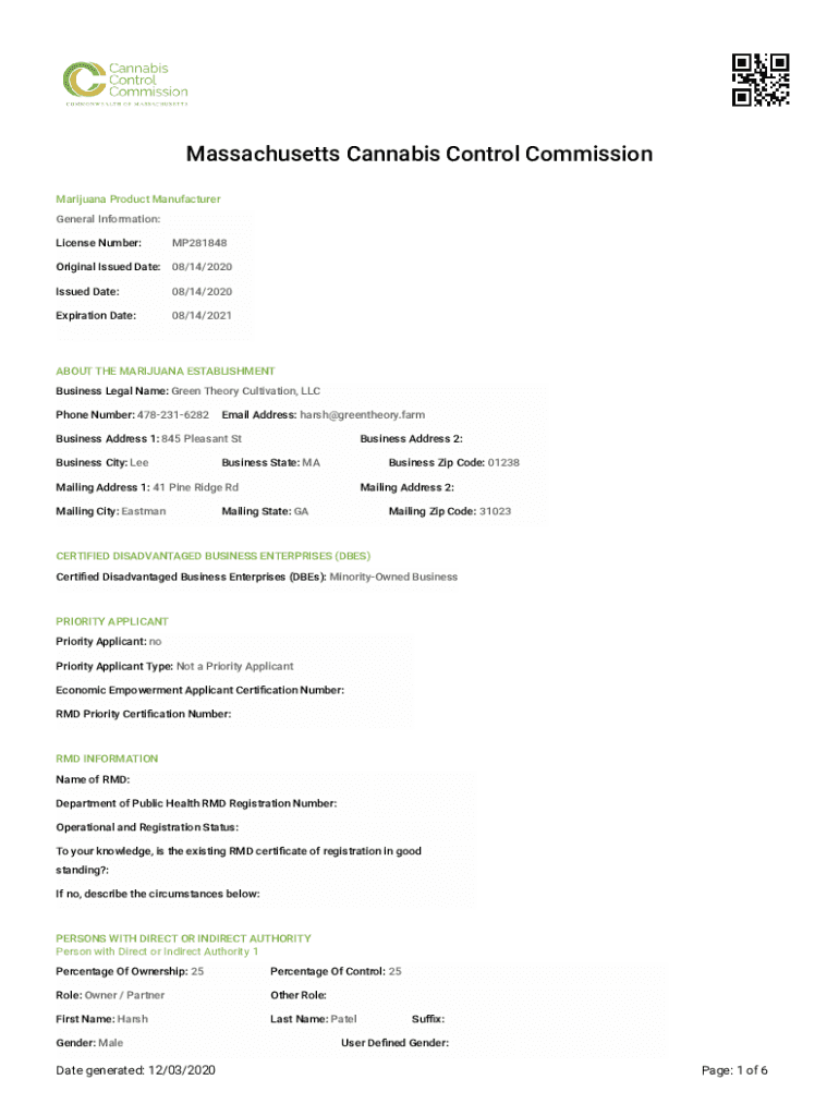 Massachusetts Cannabis Control Commission Marijuana Product Manufacturer General Information: License Number:MP281848Original Issued Date: 08/14/2020 Issued Date:08/14/2020Expiration Date:08/14/2021ABOUT