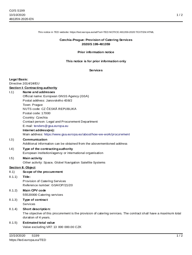 OJ/S S199 13/10/2020 4813592020EN1/2This notice in TED website: https://ted.europa.eu/udl?uriTED:NOTICE:4813592020:TEXT:EN:HTMLCzechiaPrague: Provision of Catering Services 2020/S 199481359 Prior
