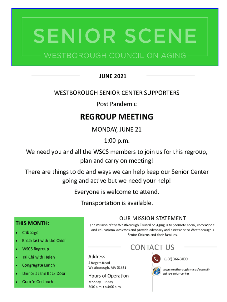 JUNE 2021WESTBOROUGH SENIOR CENTER SUPPORTERS Post PandemicREGROUP MEETING MONDAY, JUNE 21 1:00 p.m. We need you and all the SCS members to join us for this regroup, plan and carry on meeting! There