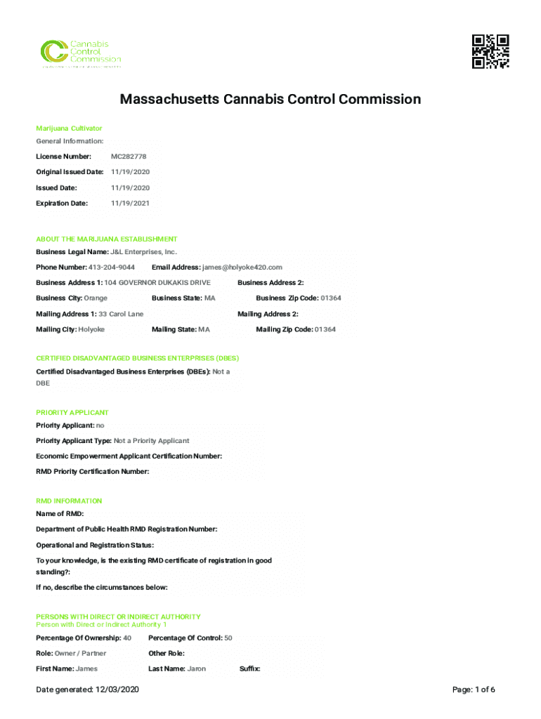 Massachusetts Cannabis Control Commission Marijuana Cultivator General Information: License Number:MC282778Original Issued Date: 11/19/2020 Issued Date:11/19/2020Expiration Date:11/19/2021ABOUT THE