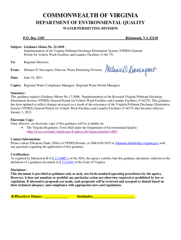 COMMONWEALTH OF VIRGINIA DEPARTMENT OF ENVIRONMENTAL QUALITY WATER PERMITTING DIVISION P.O. Box 1105Richmond, VA 23218Subject: Guidance Memo No. 222010 Implementation of the Virginia Pollutant Discharge