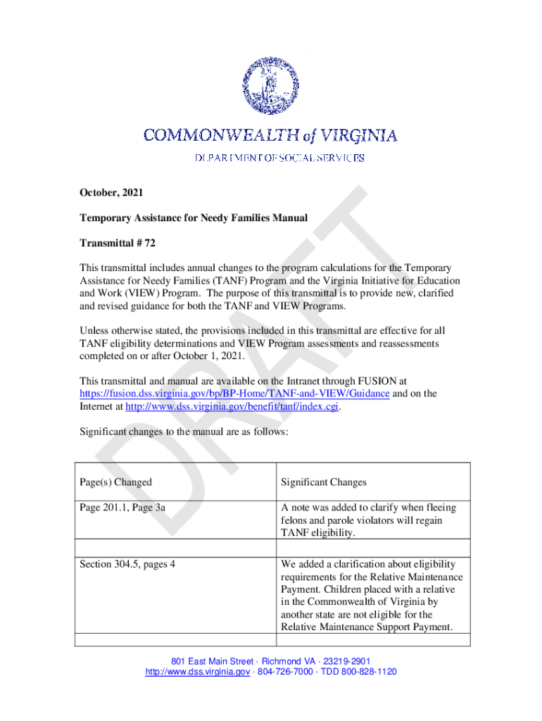 October 2021 Temporary Assistance for Needy Families Manual Transmittal # 72 This transmittal includes annual changes to the program calculations for the Temporary Assistance for Needy Families (TANK)