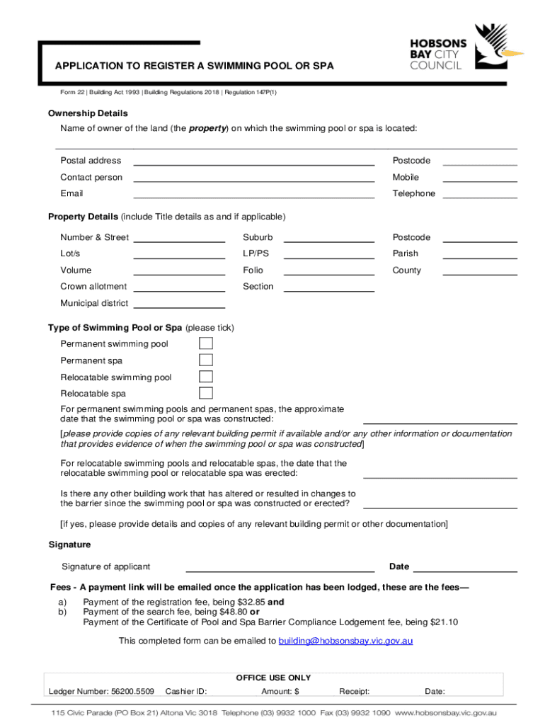 Get the free FORM 22 APPLICATION TO REGISTER A SWIMMING POOL ...