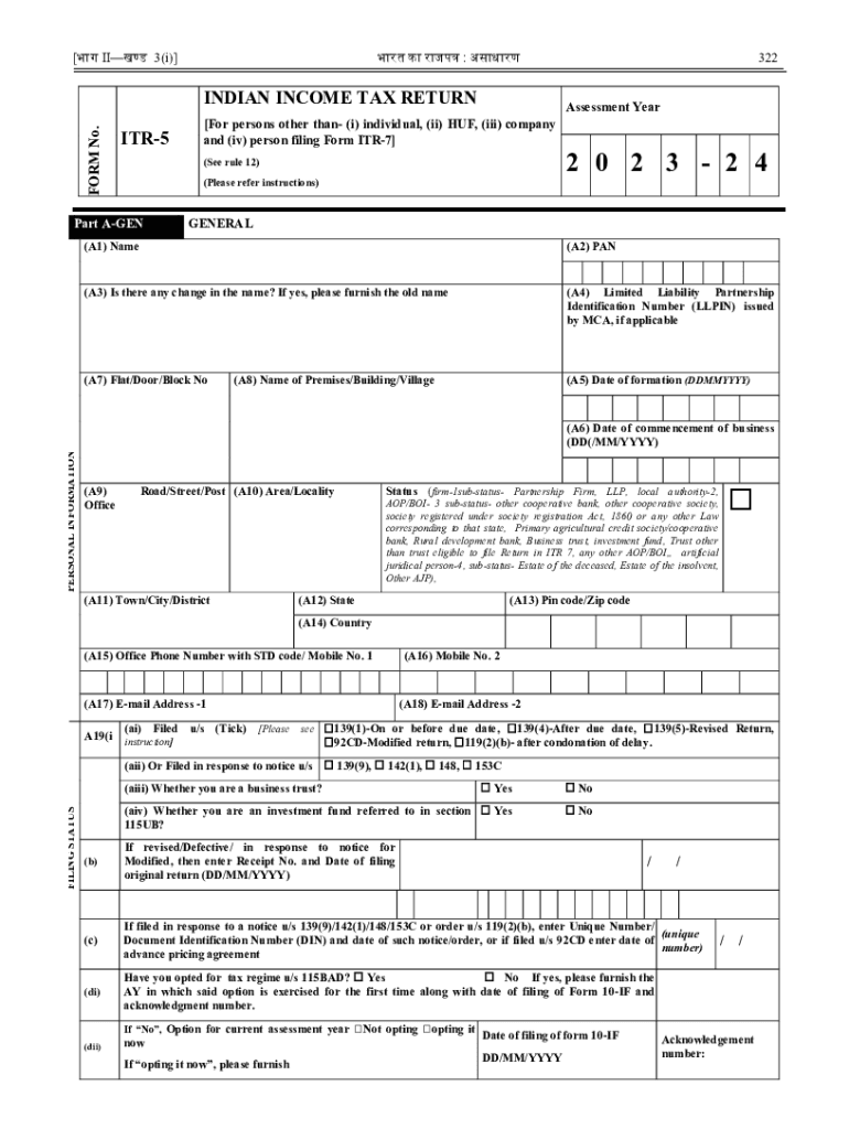 [II 3(i)] : FORM No. INDIAN INCOME TAX RETURN ITR5Assessment Year[For persons other than (i) individual, (ii) HUF, (iii) company and (iv) person filing Form ITR7] (See rule 12) (Please refer instructions)Part