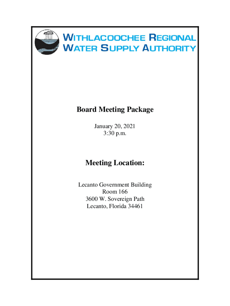 Board Meeting Package January 20, 2021 3:30 p.m. Meeting Location: Le canto Government Building Room 166 3600 W. Sovereign Path Le canto, Florida 34461Withlacoochee Regional Water Supply Authority