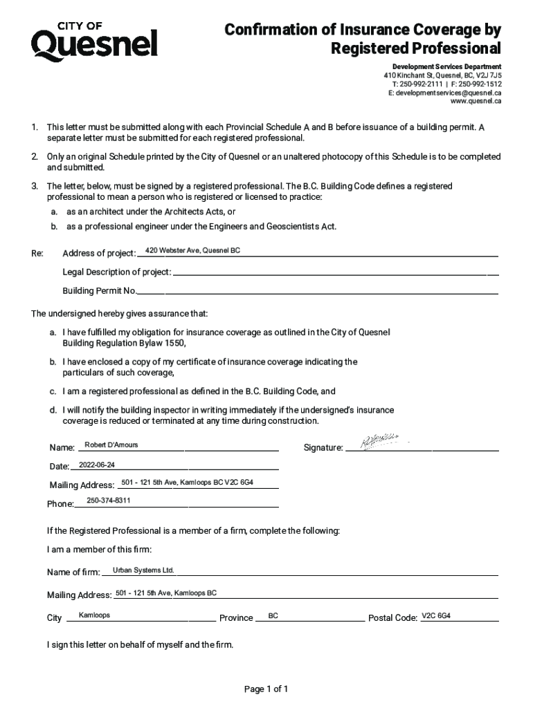 Confirmation of Insurance Coverage by Registered Professional Development Services Department 410 Kin chant St, Fresnel, BC, V2J 7J5 T: 2509922111 | F: 2509921512 E: developmentservices@quesnel.ca