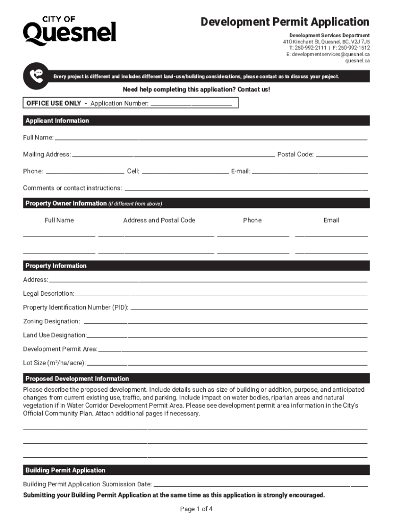 Development Permit Application Development Services Department 410 Kin chant St, Fresnel, BC, V2J 7J5 T: 2509922111 | F: 2509921512 E: developmentservices@quesnel.ca Fresnel.ca Every project is different