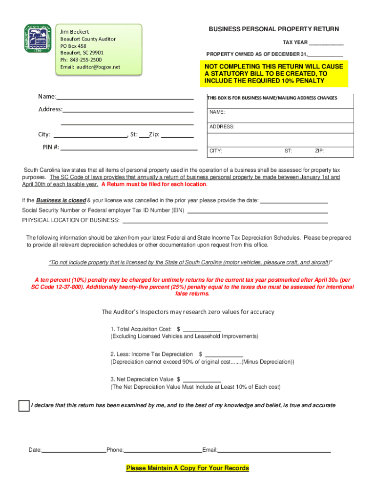 BUSINESS PERSONAL PROPERTY RETURN Jim BeckertBeaufort County Auditor PO Box 458 Beaufort, SC 29901 pH: 8432552500 Email: auditor@bcgov.netTAX YEAR___PROPERTY OWNED AS OF DECEMBER 31,___NOT COMPLETING